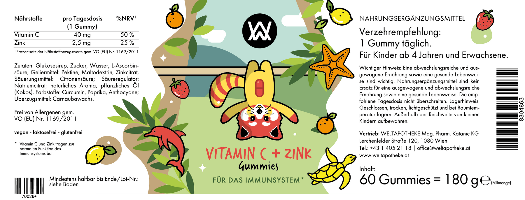 Zucchero, sciroppo di glucosio, gelatina, acido ascorbico, acido citrico, colorante curcumina, solfato di zinco, aroma naturale di limone con altri aromi naturali.